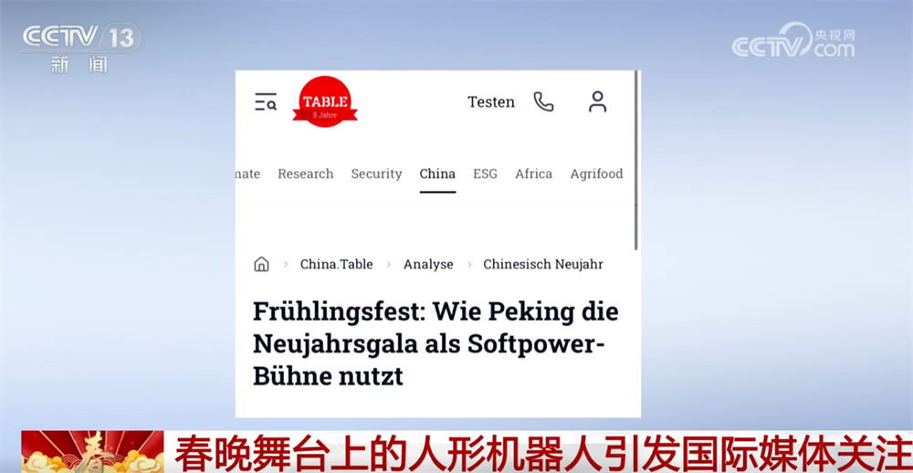 德国杂志《table Briefings》发表题为《春节:北京如何通过春晚展现软实力》的文章,报道称“马年春晚呈现了一系列机器人和人工智能表演。中国国家电视台借此展示科技实力,并展现了‘中国制造’的自豪感”。