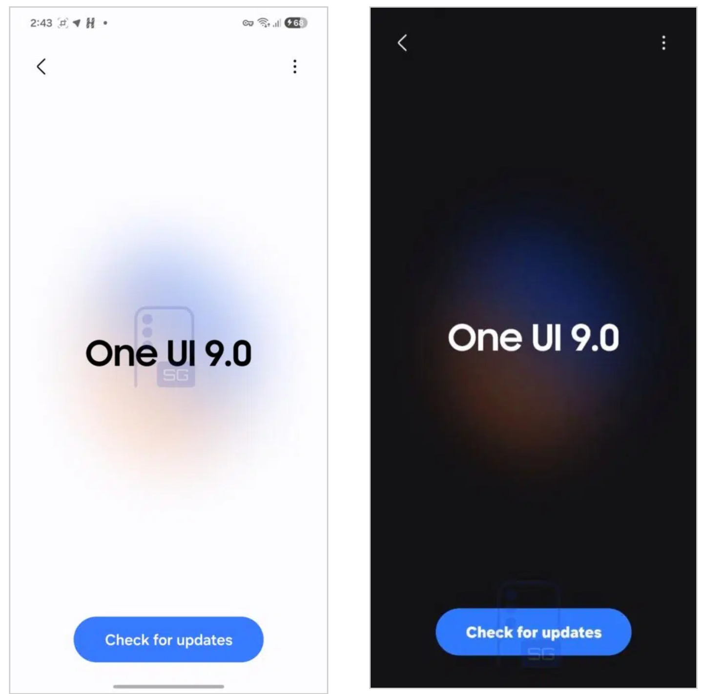 在视觉设计方面,One UI 9 的“检查更新”页面清晰显示了“One UI 9.0”字样,背景主题方面采用了红蓝配色,而 One UI 8.5 采用蓝绿配色。此外,软件安装屏幕也浮现出一张新的 One UI 9 主题图片,整体设计简洁。