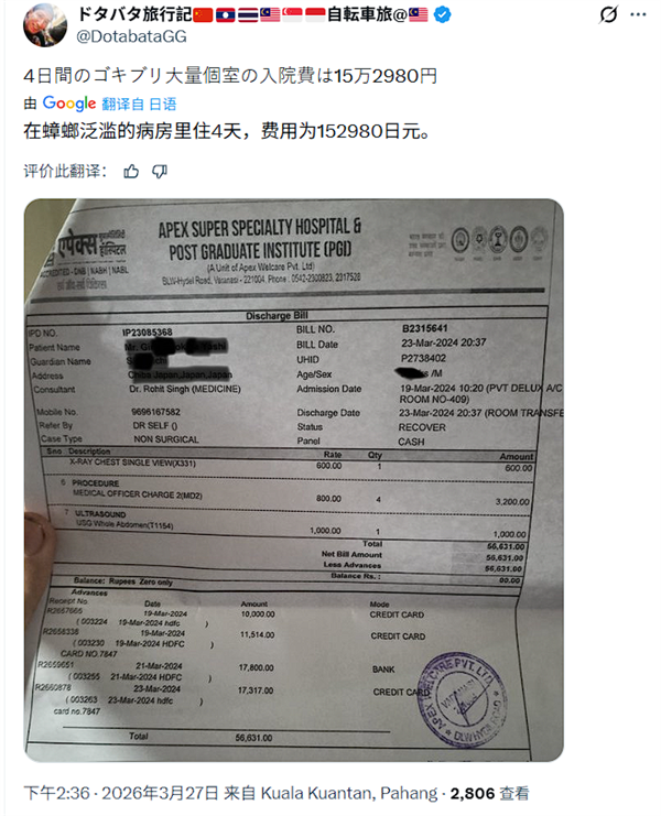 经过4天治疗,博主与同伴最终出院,但需承担约15.3万日元(折合人民币约6000元) 的高额医疗账单,是当初拒绝施舍金额的2000倍。
