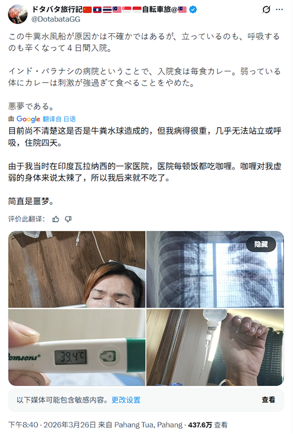 快科技3月31日消息,日前,日本旅行博主Dotabata旅行记在印度恒河岸边遭遇恶意袭击,因拒绝当地少年乞讨,被泼满身牛粪水球,引发高烧与呼吸困难,不得不紧急住院治疗。
