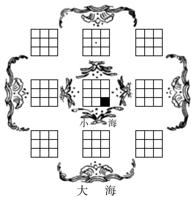 并且由其它八个大小和“赤县神州”组成第二层的“裨海神州”,由九个“裨海神州”共同组成一个大九州,在大九州的外面被大海所包围。