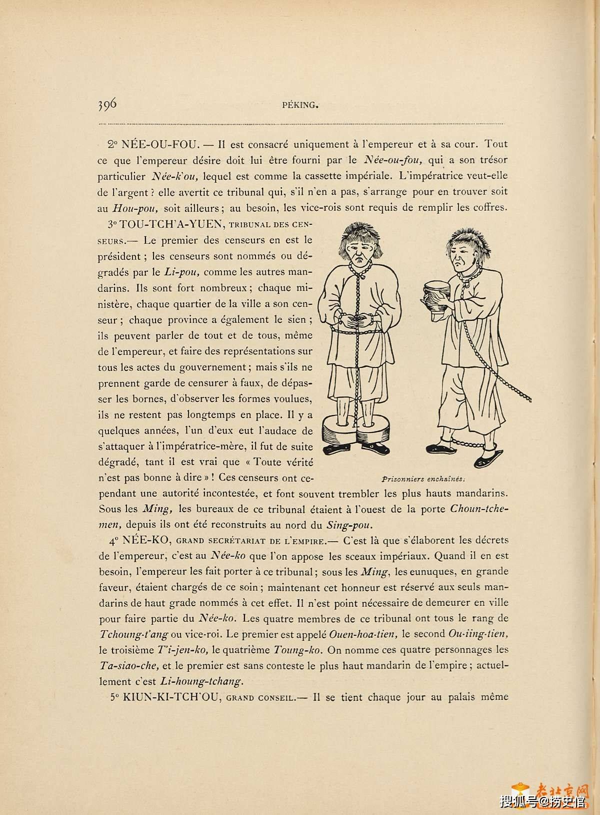 在早期外国人介绍中国刑法时,特别提到这类犯人。他们犯的是小罪,就在犯人的所住地服刑,服刑的期限也不长。衙门不管饭,甚至三顿饭都可以在衙门指定的公共场所吃(家人可以送饭)或乞讨,但不能回家。晚上住在寺庙或祠堂,由“保甲”担保。由于他们携带一个“重物”,不可能“逃走”。服刑人一般也不愿意服刑期逃跑而罪加一等。他们和押送犯人不同,外出时无须衙役看管。由于这种监外服刑本身就是象征性的,带有侮辱性,戴的链镣铐可大可小,有点钱的,花钱戴副小的,外出时还可以遮掩算“不要太丢脸”。图一那人的打扮可能是读书人,别太让“斯文扫地”才有了那样的走姿。