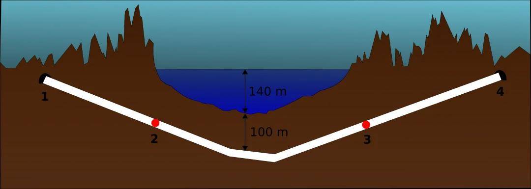 青函隧道双线设计,长53.85千米,海底部分长23.30公里,海底段最大水深140米,隧道距海底100米。