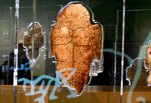 ▲河南安阳殷墟博物馆新馆内展出的刻辞卜甲(图片来源:新华社记者李安摄)