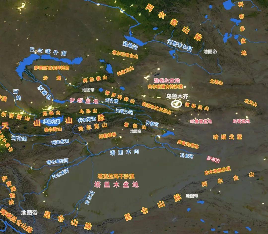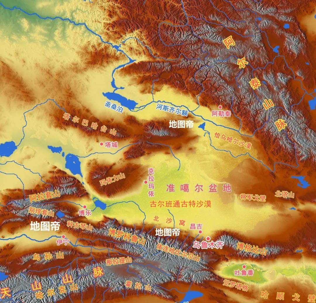 准噶尔盆地中间几乎都是沙漠,城市大多分布在边缘,其中南缘有乌鲁木齐、石河子,西缘有克拉玛依等。