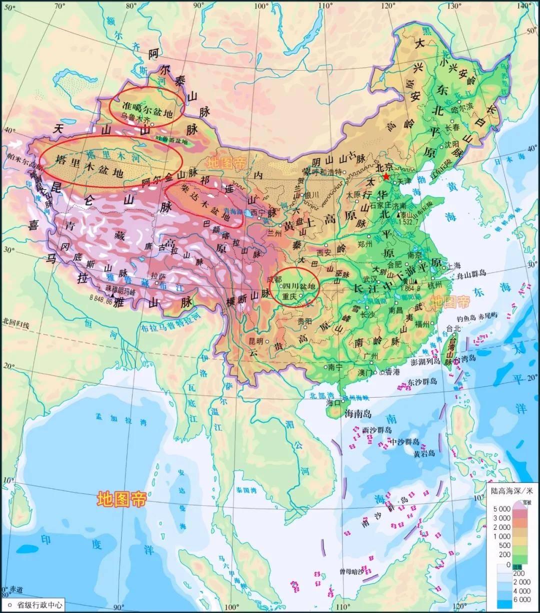 我国四大盆地,按照从北往南的顺序,依次来看下:准噶尔盆地、塔里木盆地、柴达木盆地、四川盆地。