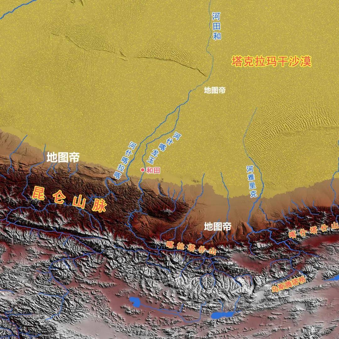 和田地区位于新疆最南端,南枕昆仑山脉,北部深入塔克拉玛干沙漠腹地,面积24.74万平方千米。和田地势南高北低,南部雄伟的昆仑山成弧形横贯东西,中部为峡谷遍布的山前坡麓地带,北部为塔克拉玛干沙漠,由南部山地7167米下降到北部1050米。