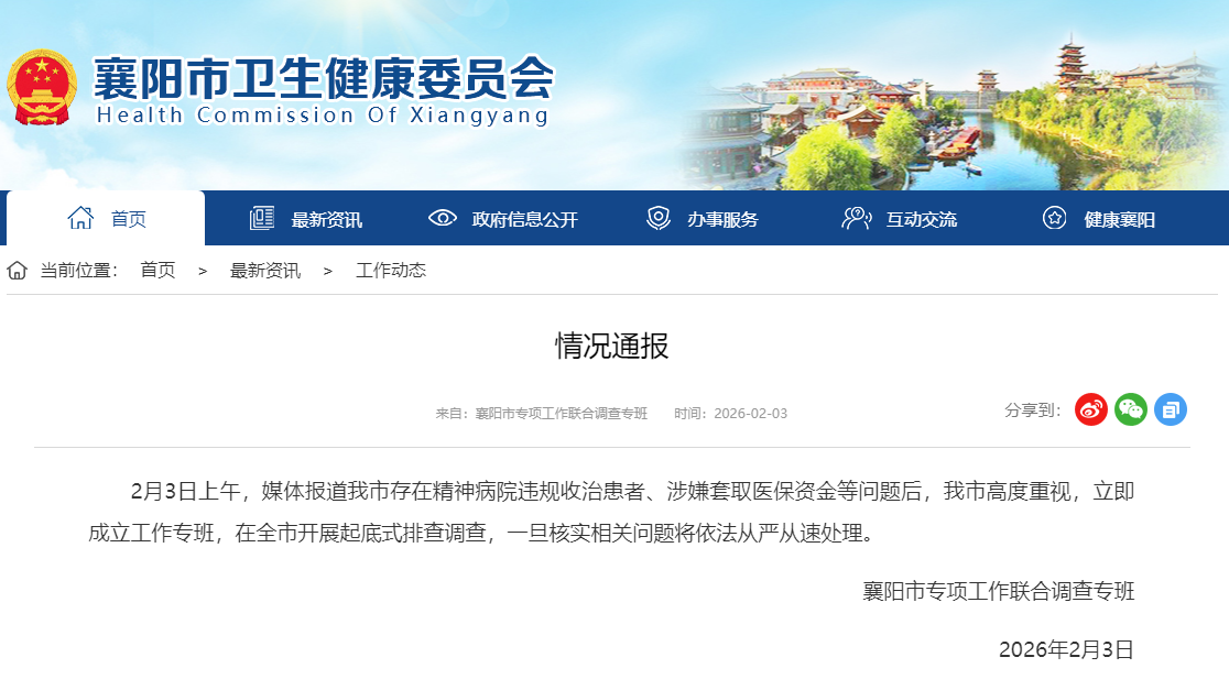 中国网2月3日讯 襄阳市专项工作联合调查专班通报:2月3日上午,媒体报道襄阳市存在精神病院违规收治患者、涉嫌套取医保资金等问题后,襄阳市高度重视,立即成立工作专班,在全市开展起底式排查调查,一旦核实相关问题将依法从严从速处理。