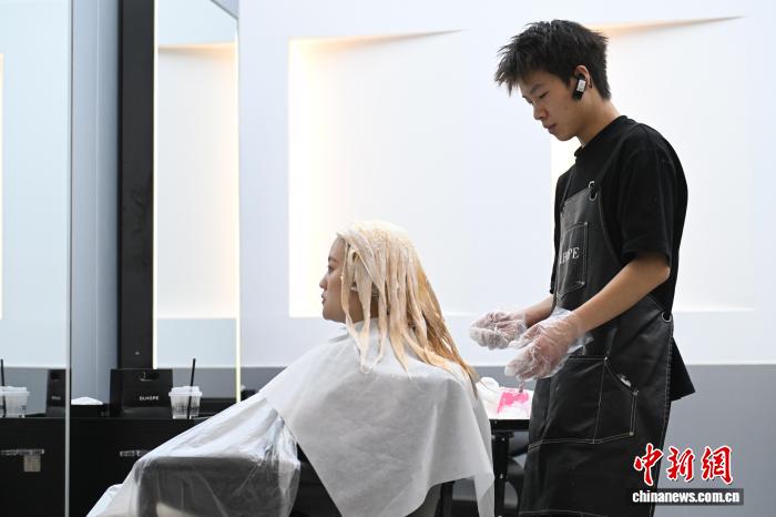理发师为年轻顾客染发。 中新网记者 刘文华 摄