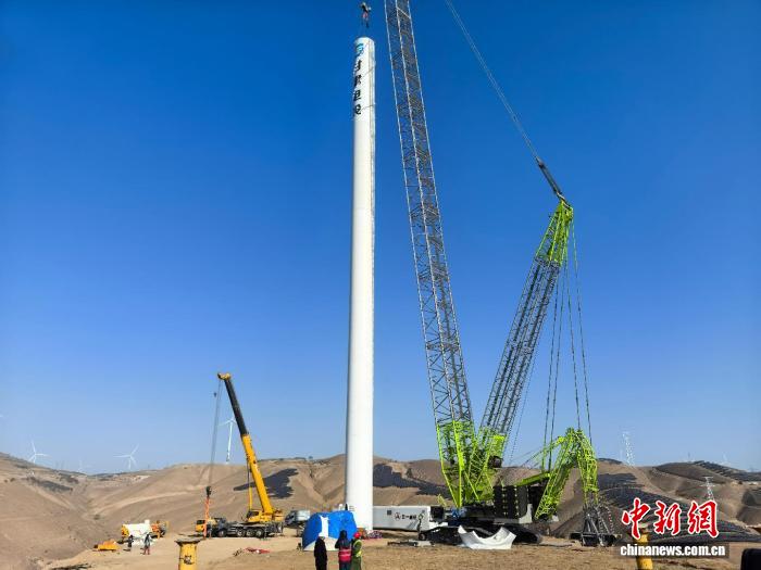 图为庆阳绿电聚合新能源项目风机塔筒吊装场景。 甘肃电投集团供图