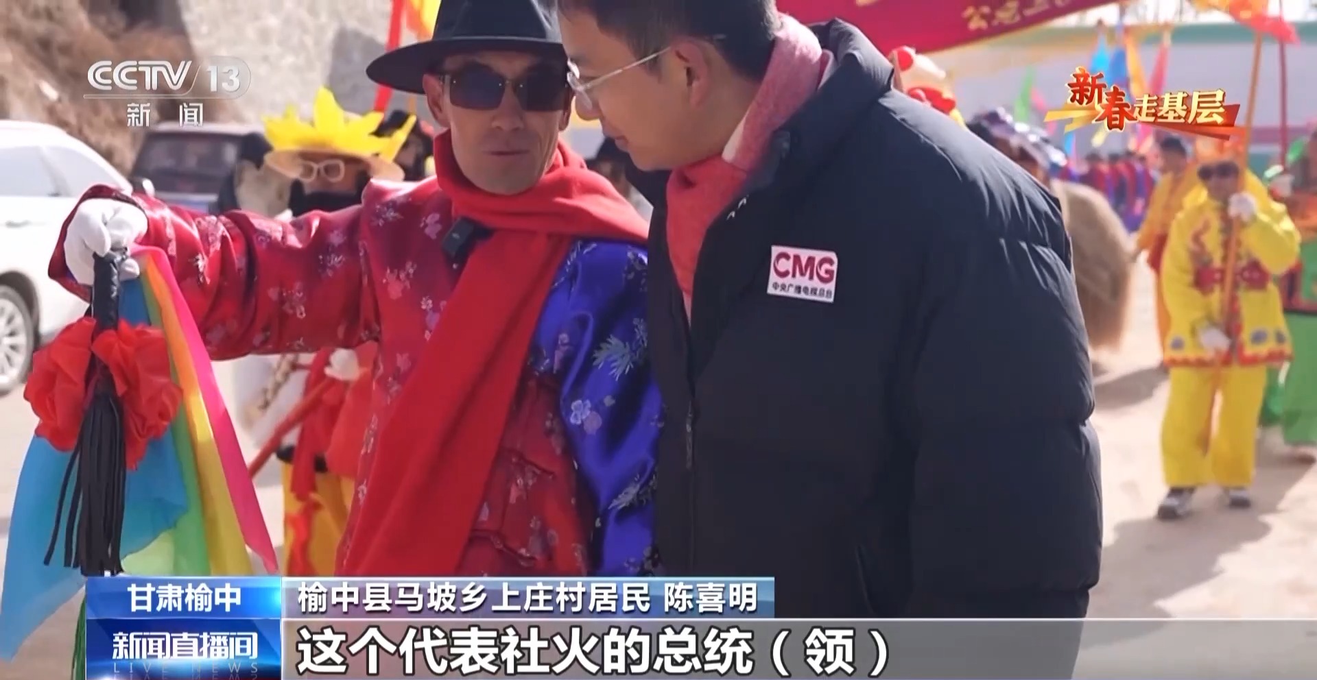 榆中县马坡乡上庄村居民 陈喜明:这个代表社火的总统领,是给我们引场子的,社火就是把大家召集到一起,前段时间这里遭灾,搞个社火把大家的精神提一提。