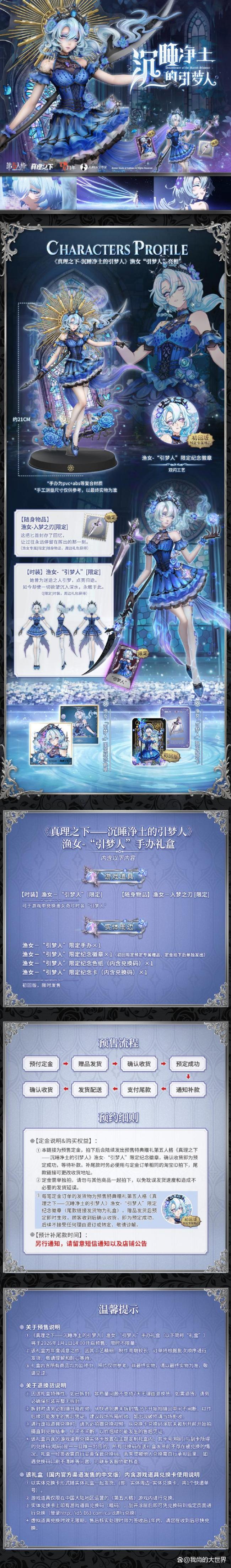 第五人格游戏官方公布了全新求生者斗牛士的三视图、深渊珍宝IX活动以及真理之下新成员“引梦人”的情报。其中,“引梦人”手办礼盒包含渔女紫皮-“引梦人”、渔女蓝挂-入梦之刃(初回版赠送)、限定纪念徽章和限定纪念色纸等丰富内容。此外,还有一张限定纪念卡“引梦人”战斗黑杰克系列SP特典金卡。