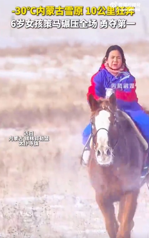 而锡林郭勒盟第三届冬季蒙古马超级联赛的赛场,气温低至-30℃,6岁蒙古族女孩恩科娜仁骑着7岁蒙古马出战,从发令枪响便全程领跑,身着骑手服的她骑姿标准舒展,身体随马匹步伐灵活起伏,面对湿滑的浅雪路段,干脆利落地完成拉缰、控速操作,察觉爱马爬坡呼吸急促时,适时放缓速度温柔安抚,最终以绝对优势冲线。作为在草原文化中长大的孩子,她从小跟随父辈接触马术,每日的骑术打磨让她与马匹建立了高度默契,也练就了直面挑战的勇气。
