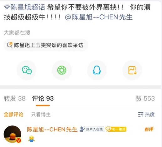 粉丝在陈星旭微博评论区留言:“希望你不要被外界裹挟!!你的演技超级超级牛!!”。陈星旭本人账号“陈星旭--CHEN先生”随后直接回复了该留言。尽管回复具体措辞未完整公开,但多家媒体和粉丝均描述其回应“温暖”“真诚”。此次互动发生在陈星旭主演的《轧戏》收官(1月26日)与《突然的喜欢》开播期(1月22日)重叠阶段,其因《轧戏》中“肖稚宇”角色收获大量新剧粉。
