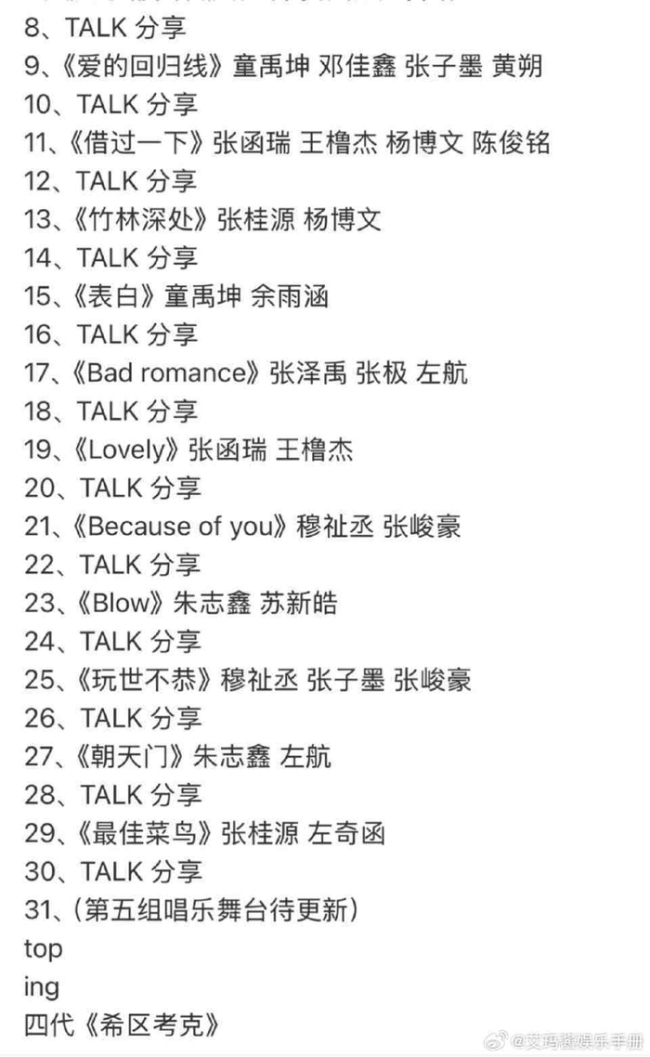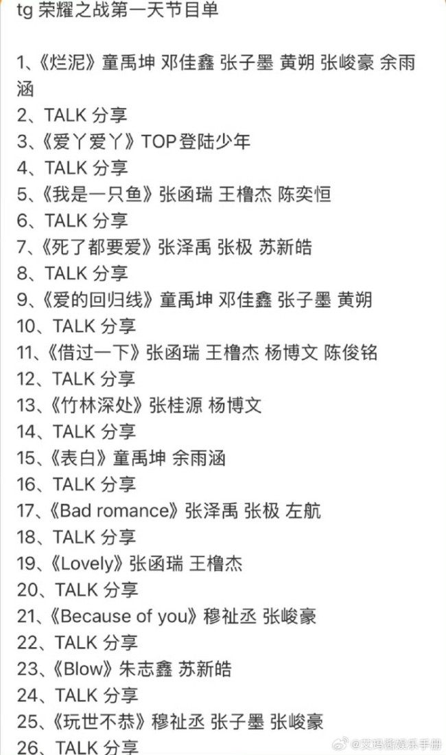 荣耀之战第一天的歌单已经公布,众多才华横溢的选手们将带来精彩的表演。朱志鑫、张泽禹、张极、左航和苏新皓等五位选手组成了TOP团队,他们备受期待。七匹狼团队则由余宇涵、张峻豪、穆祉丞、邓佳鑫、张子墨、黄朔和童禹坤组成。此外,四代团队包括王橹杰、张桂源、杨博文、陈奕恒、左奇函、陈浚铭、张函瑞和陈思罕。每个团队都将全力以赴,为观众呈现一场难忘的音乐盛宴。