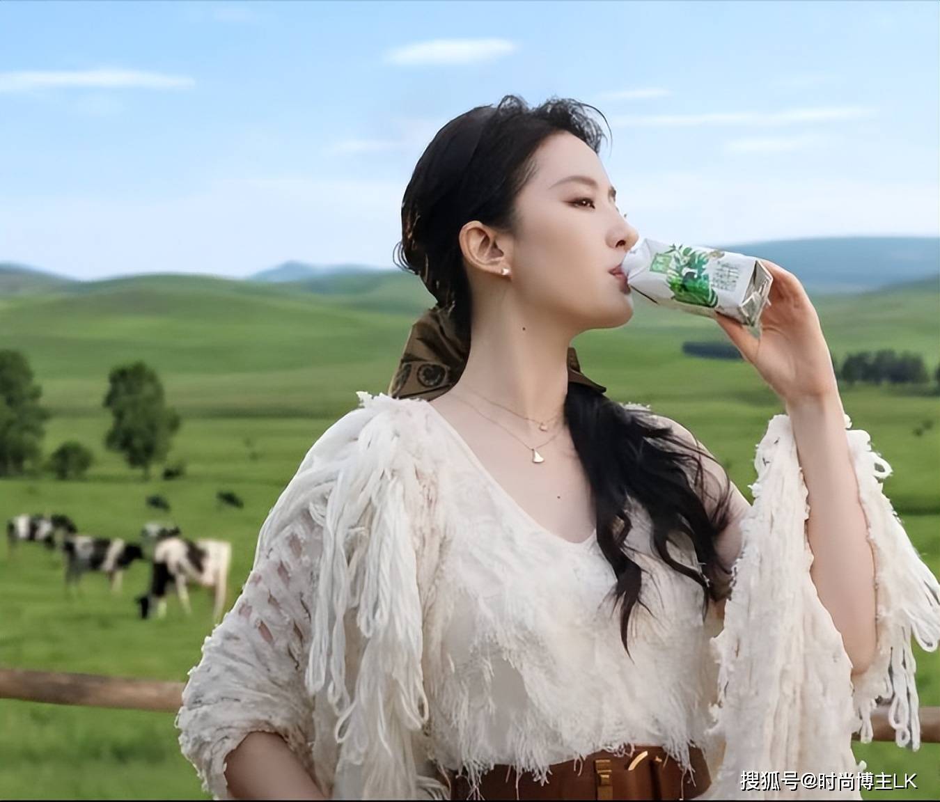 只见她的头发用飘带扎成一个温婉的低马尾,站在满是绿草地的草地里,一会儿和小动物对话,一会儿拿起牛奶就喝起来,
