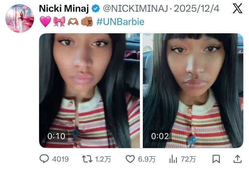 一开美颜相机,Nicki的五官直接被柔化到极致,唇色调成豆沙粉,眉毛画得像日系漫画少女,连下巴线都给磨得圆润无攻击性。结果就是——整个人从“踩着所有人”的Boss感,变成了“需要被抱抱”的小白花。网友已经疯了:这滤镜谁顶得住?变年轻不是重点,重点是她每次都能把“年轻漂亮”玩出新花样,服气。