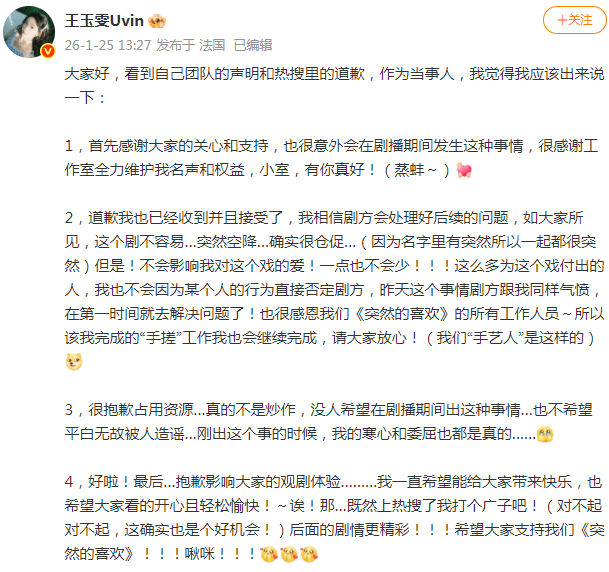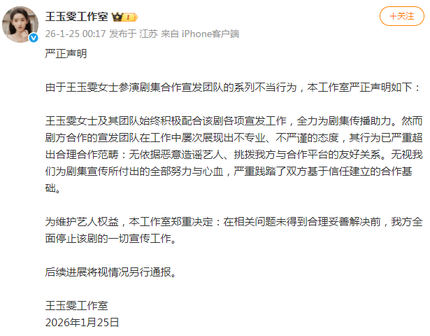 1月25日凌晨,王玉雯工作室在全平台发布严正声明,说要全面停止这部剧的一切宣传工作,原因是艺人积极配合宣传,但剧方合作的宣发团队不专业、不严谨,不仅恶意造谣艺人,还挑拨他们与合作平台的关系。
