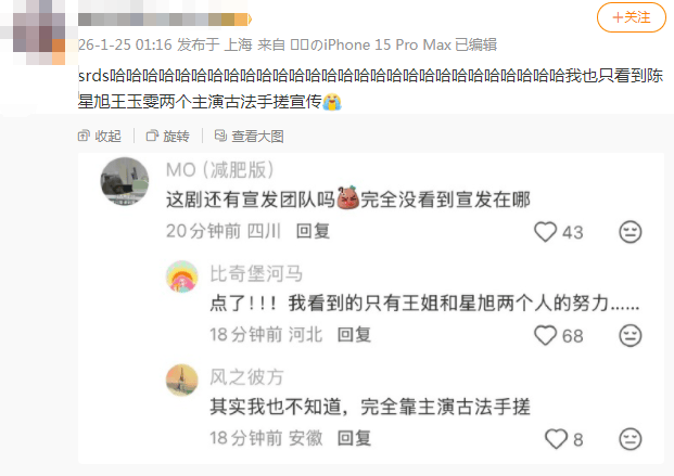 网友难得一边倒,都在帮王玉雯说话,有嫌弃这部剧宣发太差,出圈全靠主演努力的。(更何况两位主演熟人局,陈星旭拍抽象剧宣容易i人属性大爆发,放不开的时候全靠王姐带动气氛)