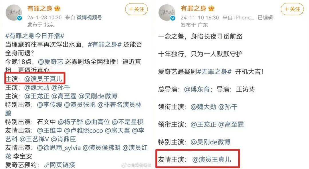 这个剧在空降播出当日爆改一番,原本的六番王真儿被提到一番位置,前五番依次后移一位,显然是前五番的角色都不清白,只有王真儿饰演的刑警队长纯然正面,倒是扣上了剧名《无罪之身》→《有罪之身》的变动,但这样一来也剧透得相当彻底。