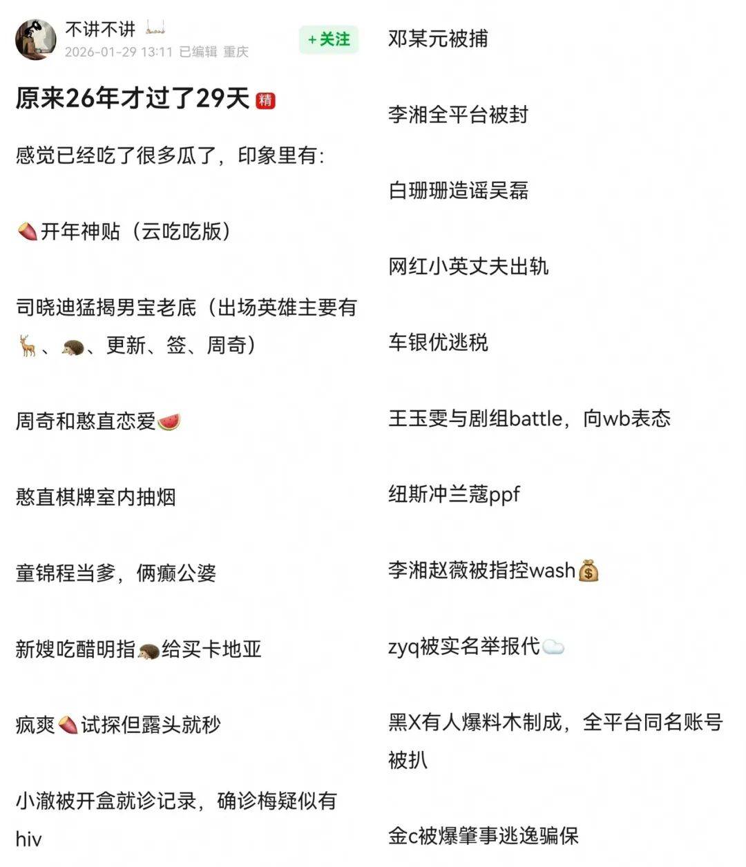 自打踏入2026,内娱、韩娱、短剧圈、网红圈全乱了套了,什么私德翻车、情史爆料、恋爱争议,什么偷税漏税、代孕举报、涉毒传闻,什么宣发背刺、剧组违规、业内反腐......
