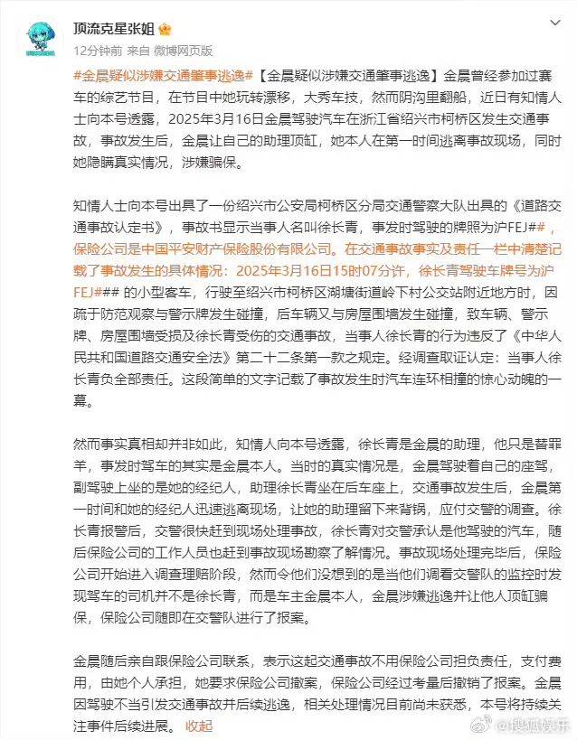 结果狗仔口中,金晨的操作却不是那么回事儿,事发后她并未留在现场配合处理,而是与经纪人第一时间迅速离开,仅留下助理应对后续事宜,让助理顶替自己承担事故责任,也就是俗称的“顶缸”。