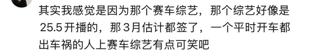 那会儿她正处在莲花跑车车代的考察期,赛车综艺《风驰赛车手》也早就签好约了,正是靠赛车人设涨好感的关键时候,哪敢出一点岔子。