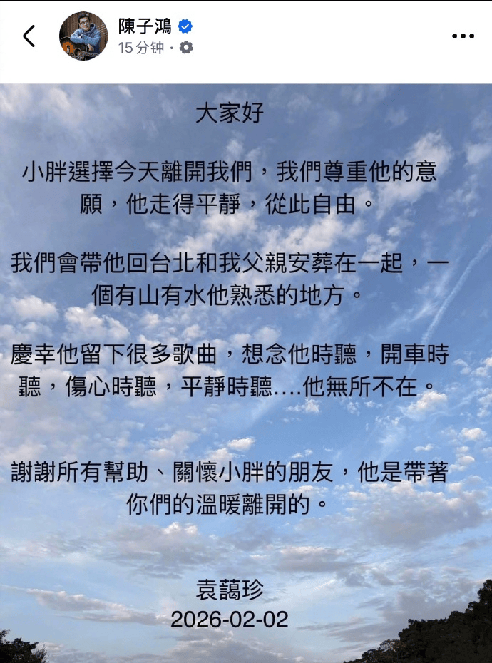 家属发布悼文,表示:“我们会带他回台北,与我父亲合葬在一起,一个有山有水、他熟悉的地方。庆幸他留下了众多歌曲,想念时听,开车时听,伤心时听,平静时听……他无处不在。” 随后,老狼也发文悼念:“R.I.P 小胖。”
