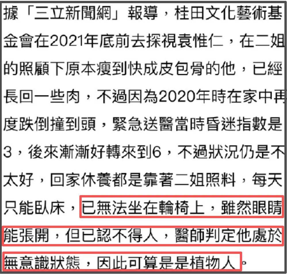 2020年,再闻噩耗。袁惟仁在家中跌倒撞到了头,紧急送医。好在最后有惊无险,袁惟仁病情没有再恶化。2022年,台媒发布新闻,报道了袁惟仁的近况,报道中称袁惟仁已经无法坐在轮椅上,虽然眼睛能张开,但已经认不得人,医生断定他处于无意识状态,可以算得上是植物人了。