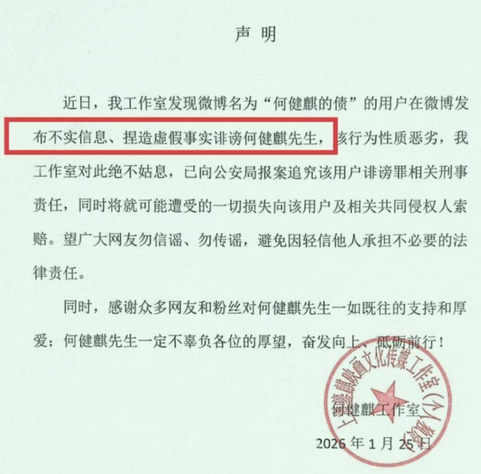 何健麒方面的反应同样迅速。工作室第一时间发布声明,明确表示相关内容为不实信息,属于恶意捏造和诽谤,已报警处理,并将依法追究责任。