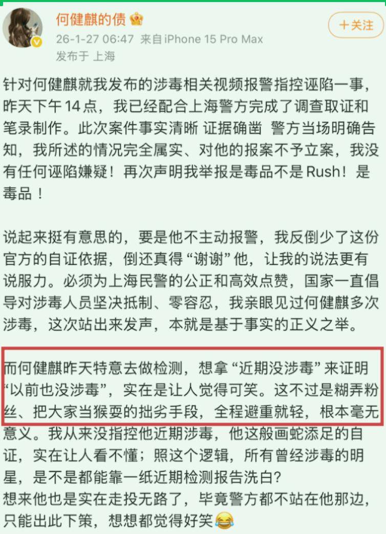 随后,何健麒本人也在社交平台发声,言辞简短,否认指控,并表示已经配合完成尿检等检测程序。