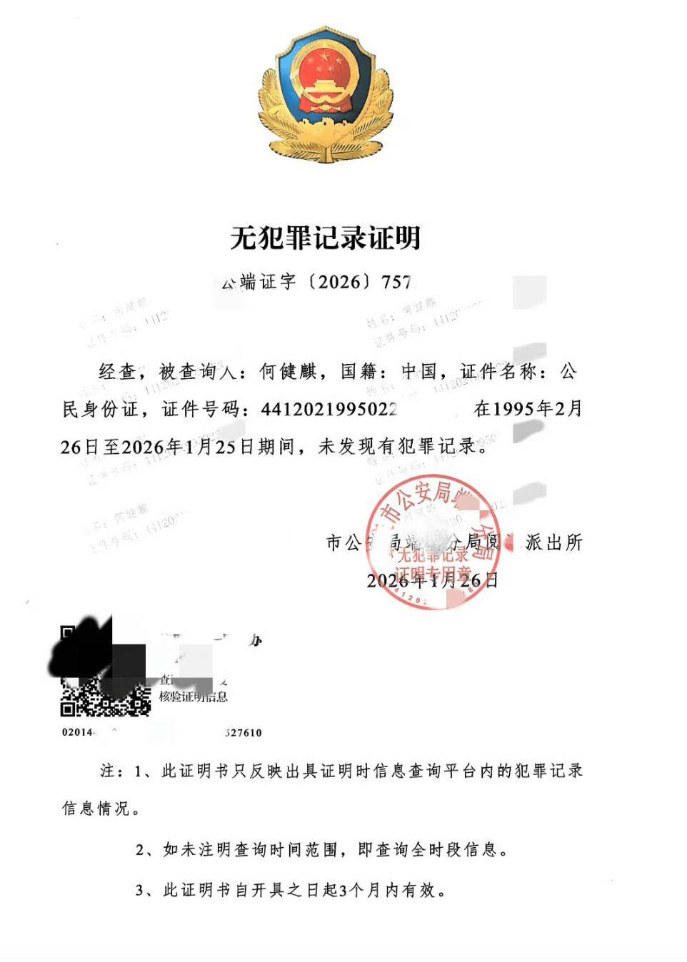 紧接着,何健麒晒出一份“无犯罪记录证明”,文件显示其自出生至今未发现犯罪记录。一时间,不少粉丝认为这是一记有力反击。