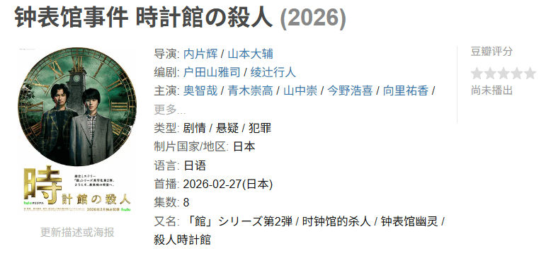 改编自绫辻行人创作的同名畅销小说,讲述了编辑江南孝明(奥智哉 饰)与同事前往神秘宅邸“钟表馆”采访灵异事件,却在封闭空间中卷入连环杀人案。同时,推理作家鹿谷门实(青木崇高 饰)也介入调查,共同揭开宅邸与过去惨剧的真相。