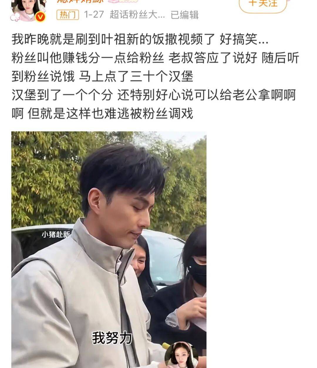 看这场面知道的是叶祖新在给粉丝们分汉堡吃,不知道的还以为是啥公益活动现场呢哈哈哈哈。