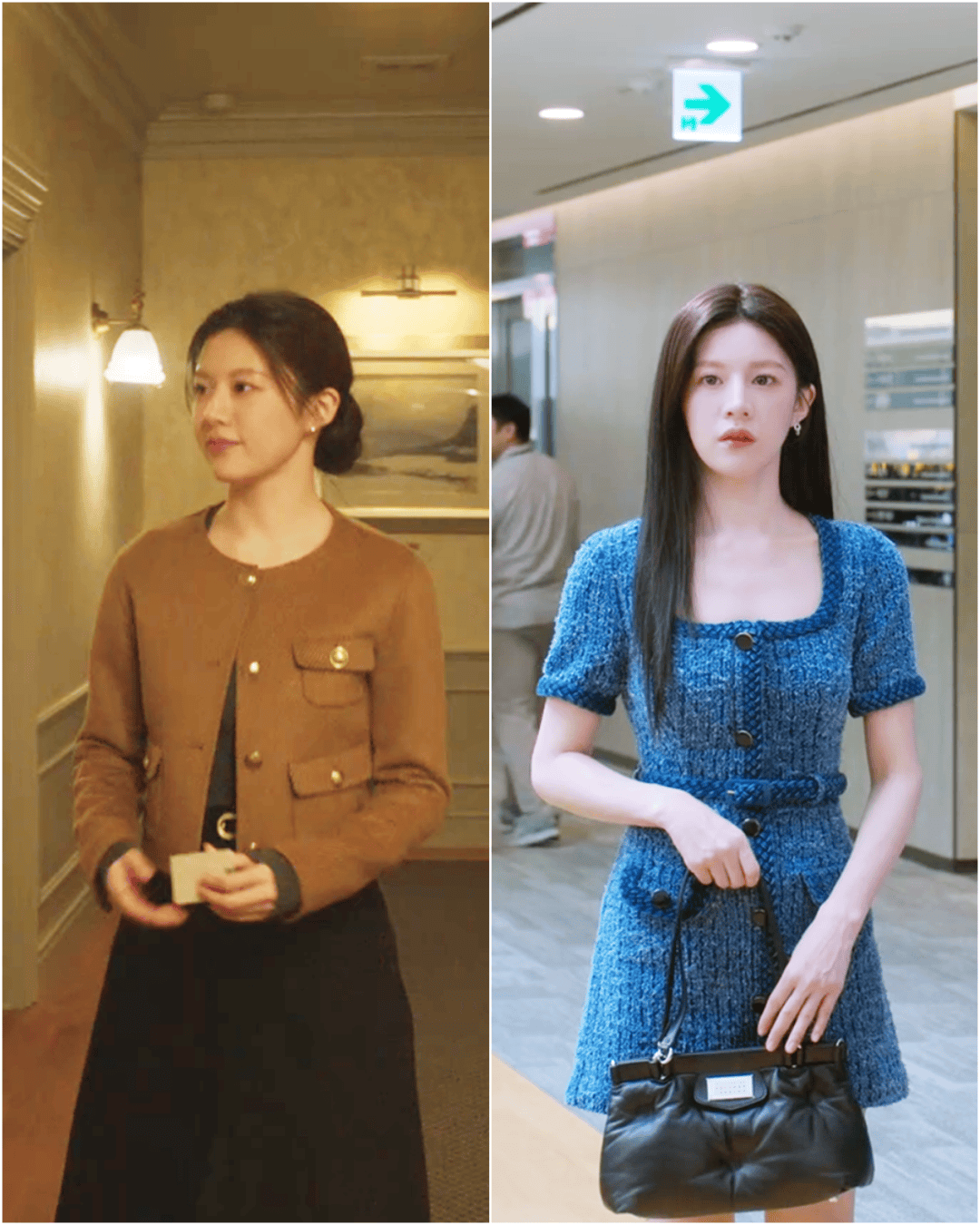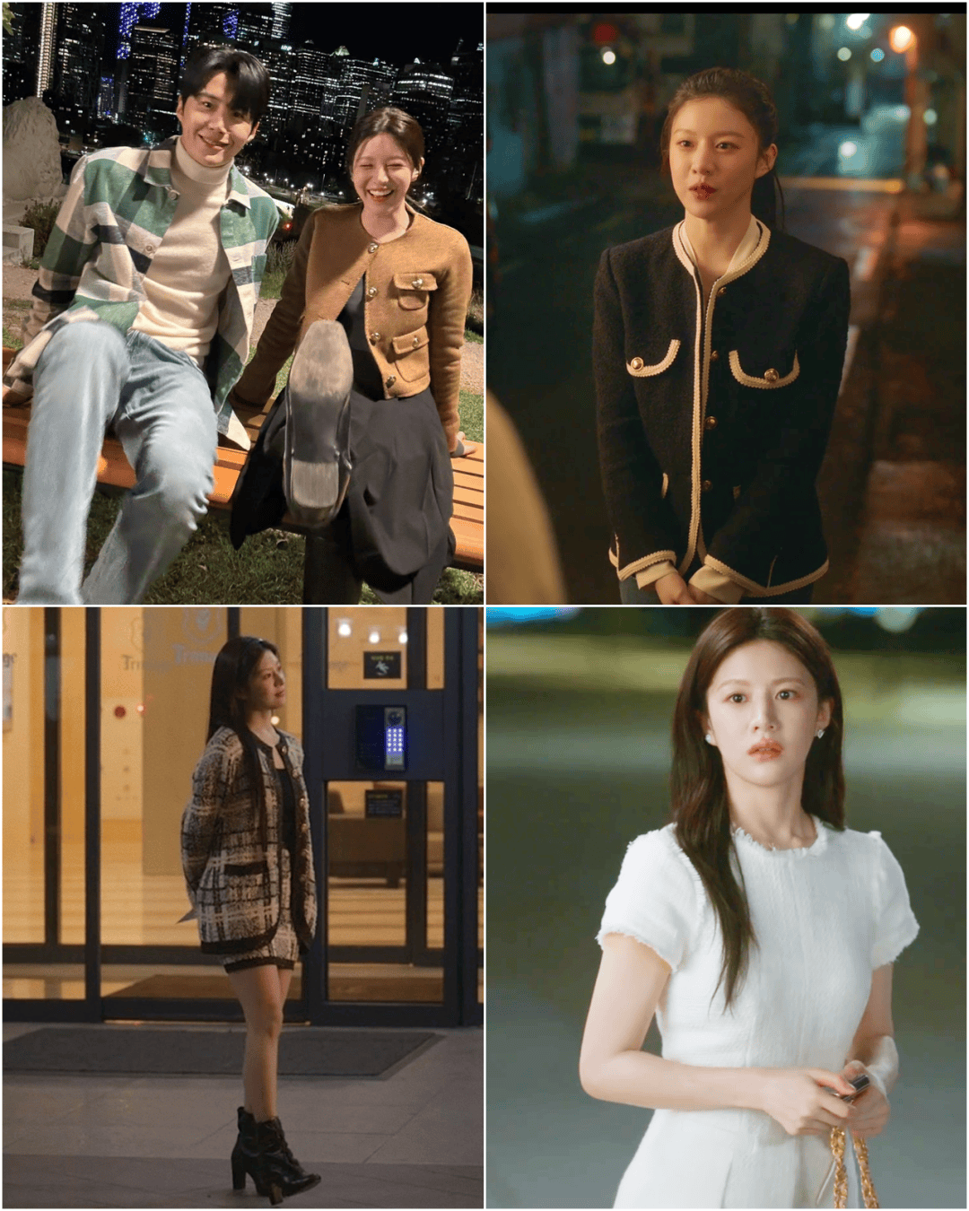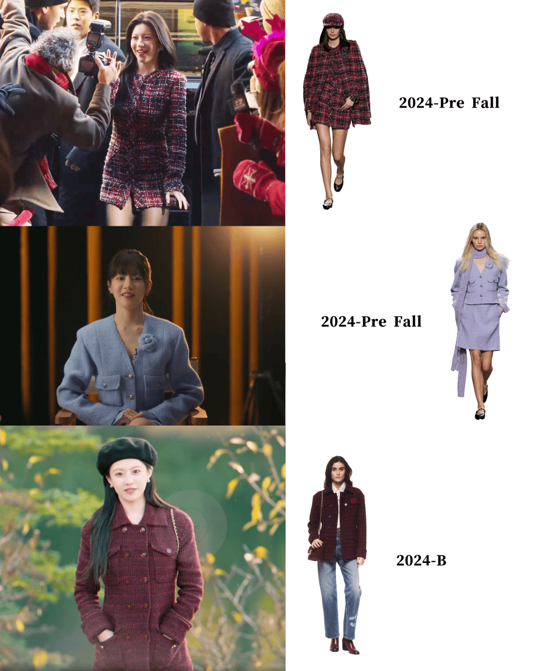 女主在剧中穿了好多粗花呢单品,一方面是韩剧造型师很喜欢给比较贵气的人设这样穿,另一方面高允真本人也和Chanel有合作关系。