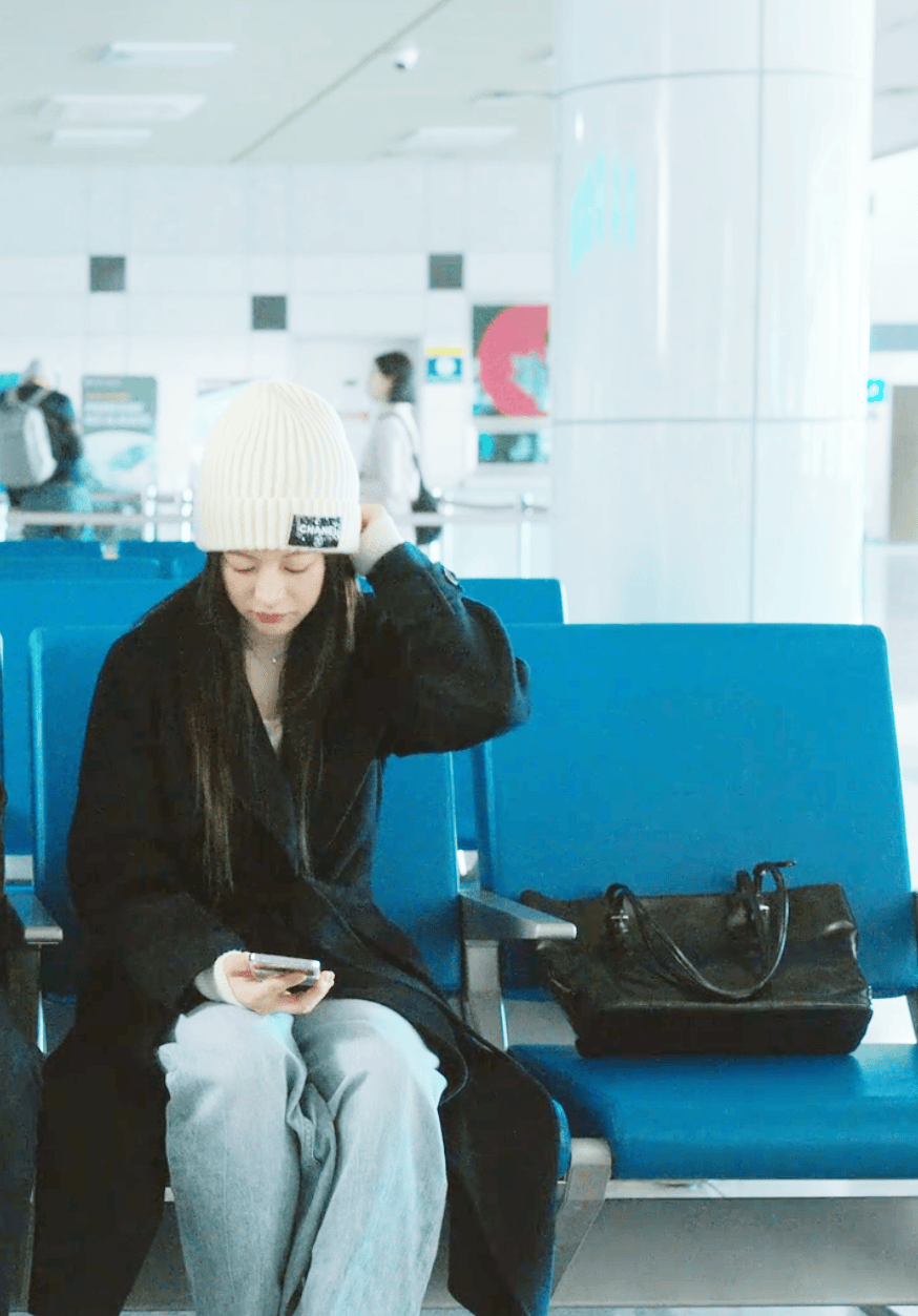剧中她也有穿颜色较深的大衣, 在穿这类大衣时,她通常会用配饰去提亮脸部。