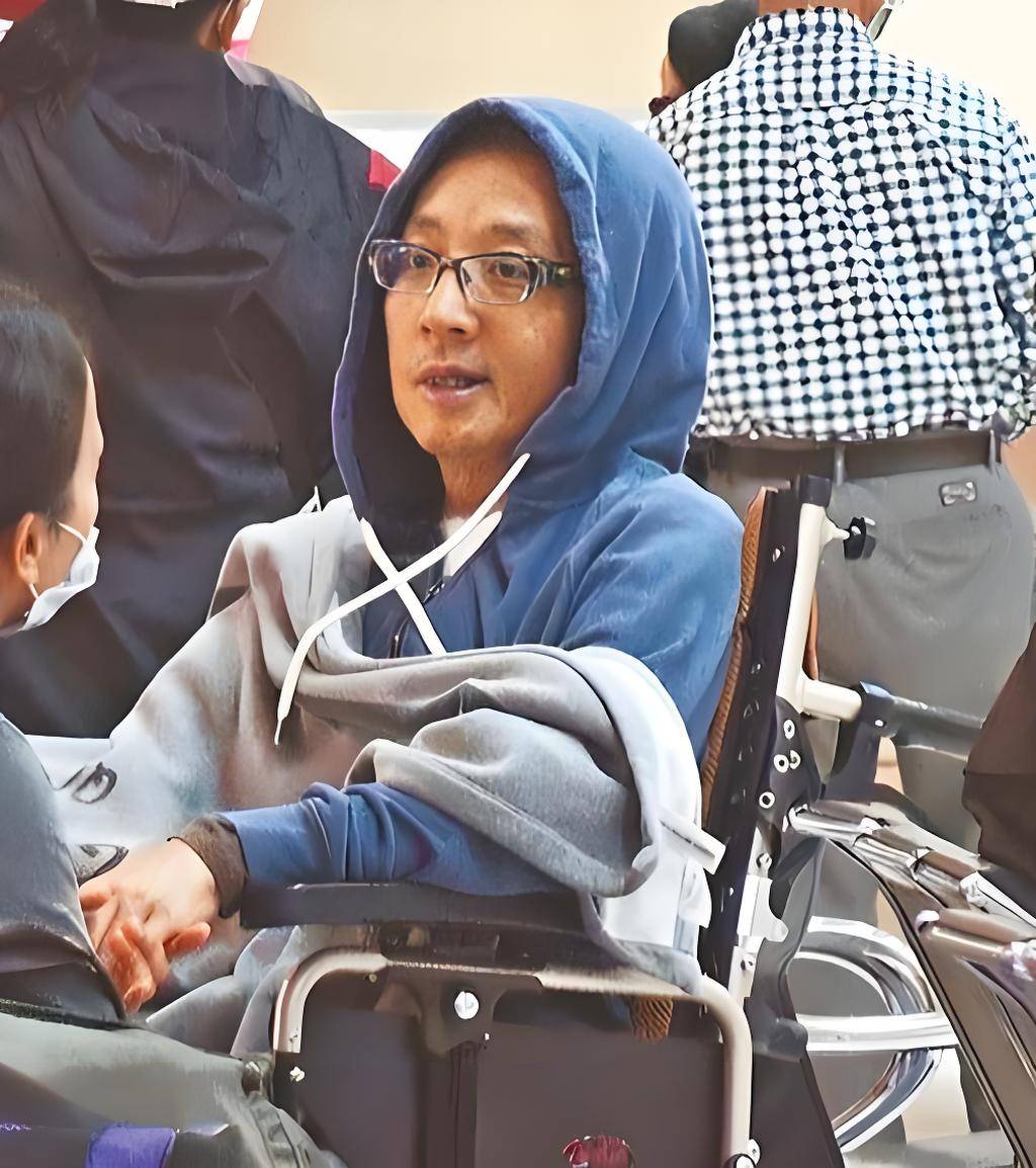 袁惟仁身体免疫力很低,坐在轮椅上,护工还要在他身上盖一条毛毯。