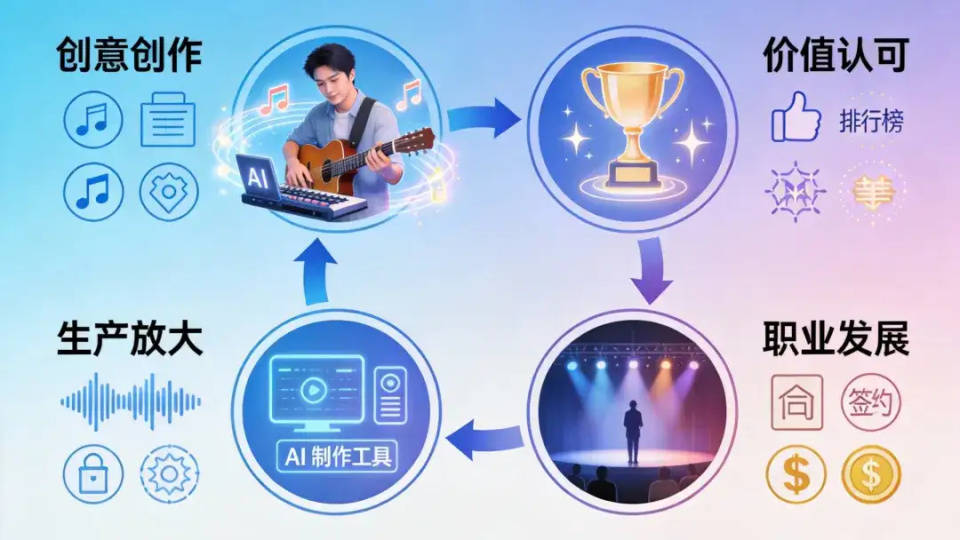 AI音乐产业化元年的清晰面貌,正是由系统化的赛事筛选、规模化的爆款内容、成熟的生产工具、以及成体系的职业化路径共同构成。它们环环相扣,形成了一个从创意诞生、价值认可、生产放大到职业发展的初步闭环。
