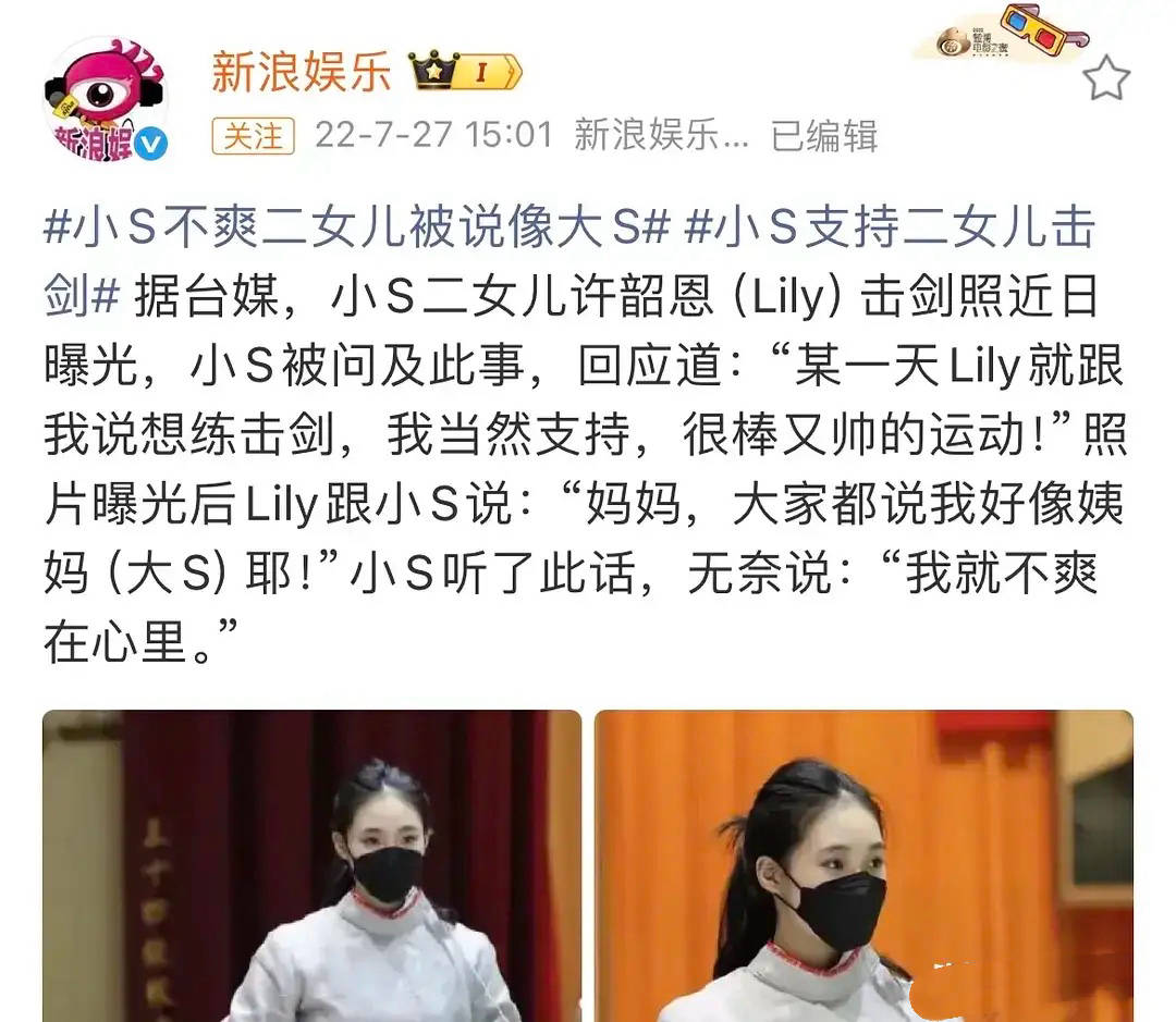 再看小S的女儿,其实Lliy被大家说长得像姨妈的时候,小S心里是很不爽的,就觉得自己又输给了姐姐一样。