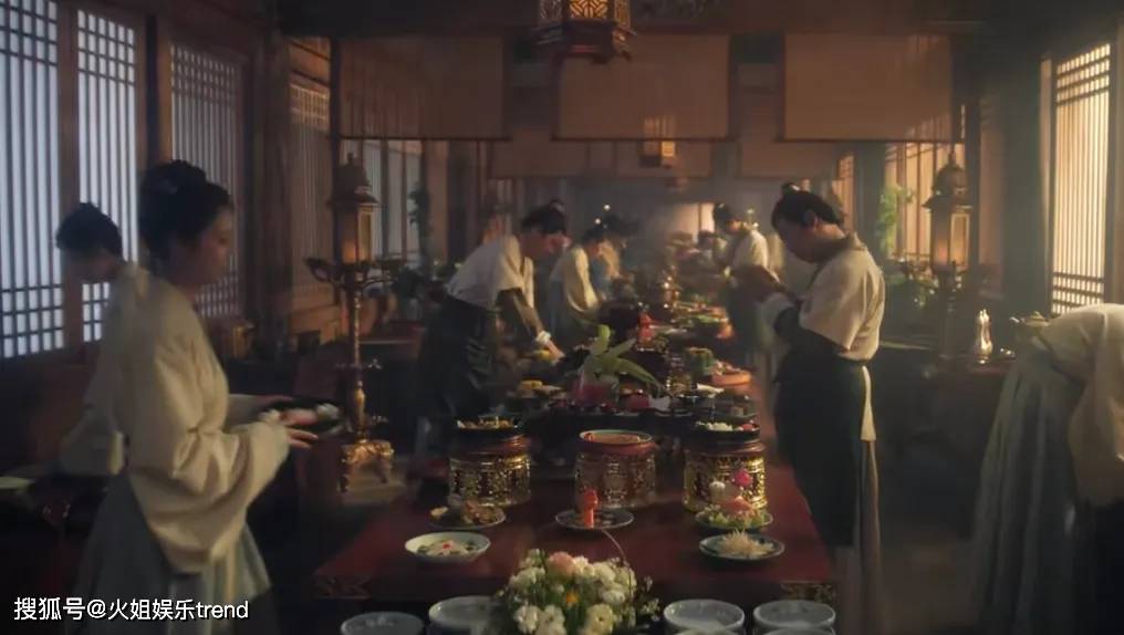 里面很多画面都很精致,比如这个后厨的画面,食材新鲜,画面人物看起来紧凑精美,俨然让观众身临富丽堂皇的宫廷生活中。