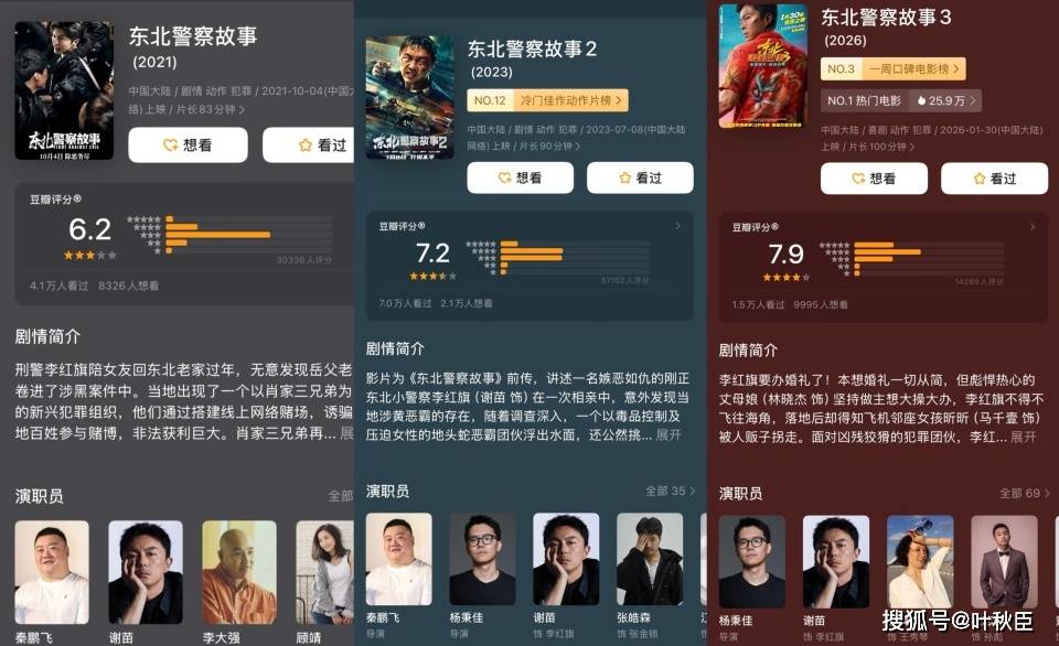 该系列的口碑趋势很神奇,与“越拍越烂”的普遍情况刚好相反,第一部豆瓣6.2分刚刚及格,第二部就跨越了档位直接比前作高出了整整1分,而第三部则是贴近了8分档位。