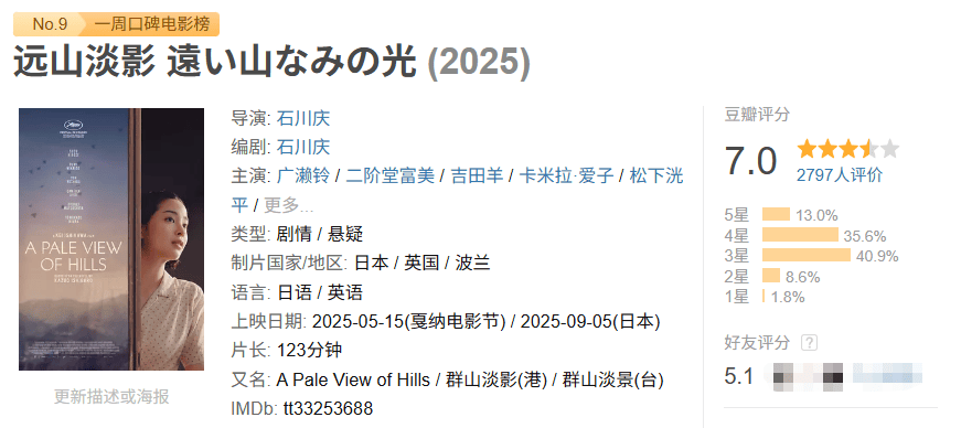 石川庆改编诺贝尔文学奖得主石黑一雄早年同名原著,双线刻画战后女性挣扎求存之境,表面平静实质波澜不休,折射出大时代下压抑而沉重的集体记忆与痛苦。