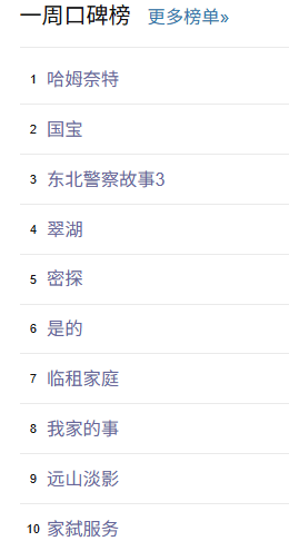 最后,还是例行附上一周豆瓣口碑榜的完整榜单: