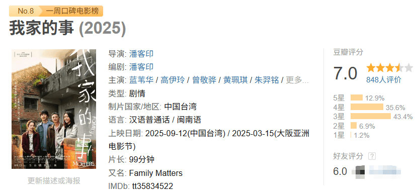 去年一部评价还不错的台片,金马和台北电影奖都有不少提名,且拿到了些奖项,也是大家很熟悉的东亚式家庭故事。