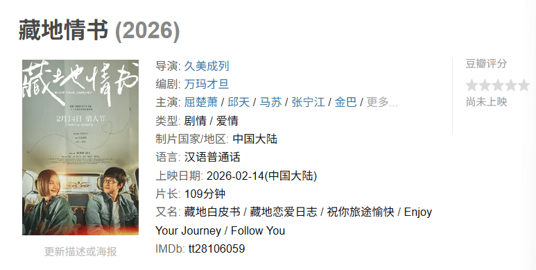 万玛才旦导演的儿子久美成列执导的爱情片,屈楚萧和邱天主演。也算是很应景的一部情人节档期爱情片了,根据《藏地白皮书》改编。