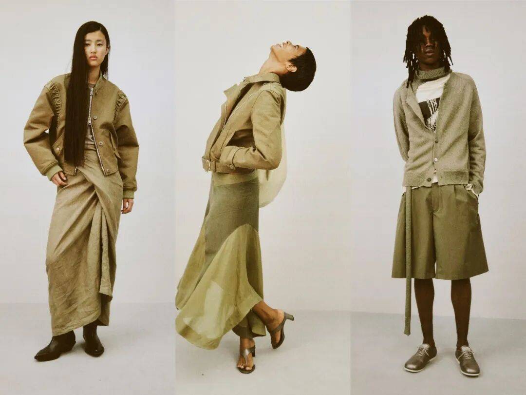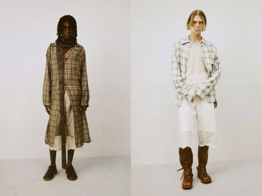 性别无界的穿搭思路贯穿全场,成为系列最具借鉴性的亮点。男式制服夹克通过腰部塑形处理,可直接适配女性身形,内搭蕾丝吊带或缎面背心,中和硬朗感;女装中的小开衩设计被嫁接到男装长裤中,搭配简约白T与复古运动鞋,增添利落细节。蕾丝元素的跨界运用堪称点睛之笔——蕾丝装饰的军装外套可搭配中性风衬衫与直筒裤,柔化工装的粗犷;女性穿着时则可内搭同色系蕾丝连衣裙,打造层次丰富的柔美造型。