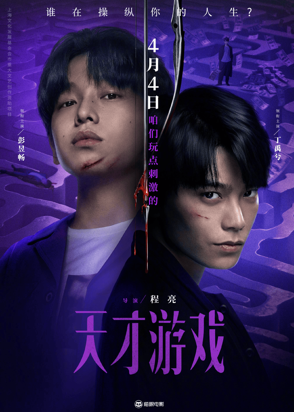 海报中一张滴血的弓箭悬于刘全龙(彭昱畅 饰)与陈伦(丁禹兮 饰)之间,两人面带血痕置身在幽暗的蓝紫色光影中,身影背后,是纸醉金迷的生活,也是错综复杂的迷宫。阴影之下,似乎有人默默伫立操纵一切,而有人已经倒在血泊之中。电影《天才游戏》由程亮导演,彭昱畅、丁禹兮领衔主演。