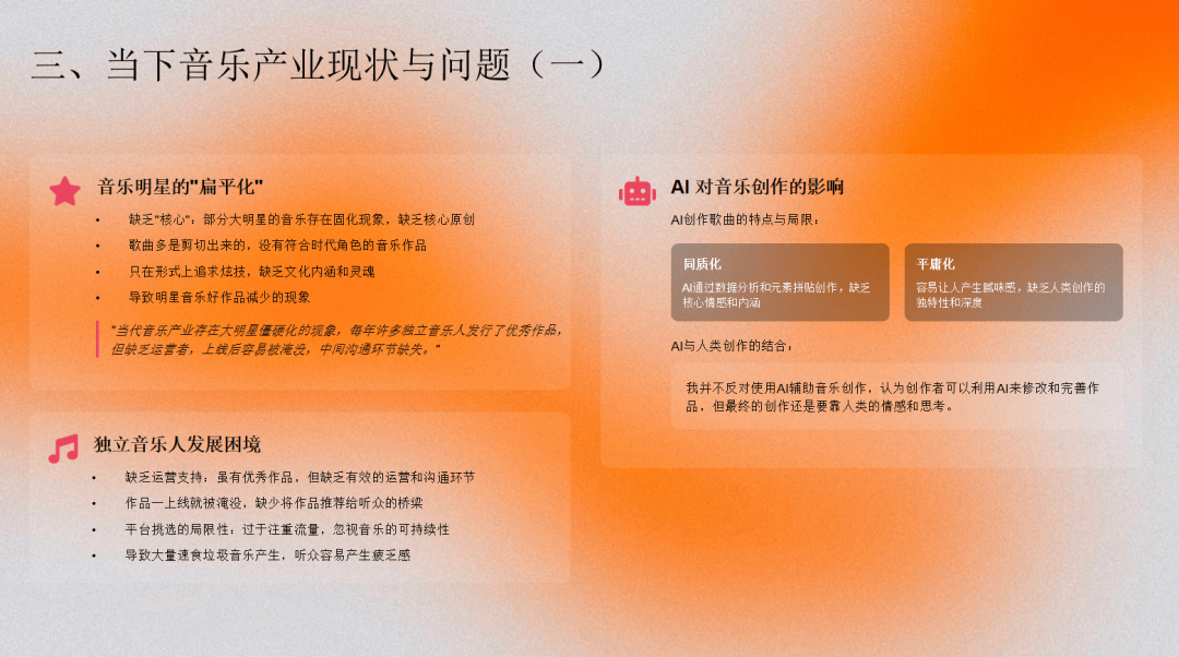 因为音乐产业最终还是要回到作品本身。明星绝对是支撑作品最重要的平台,当明星难以持续产出好作品时,听众每个月能听到的好歌的确会明显变少。当然这给了很多新的独立音乐人机会,但是平台如何给予新的音乐人好的机会或者选择,因为现在工具太好了。