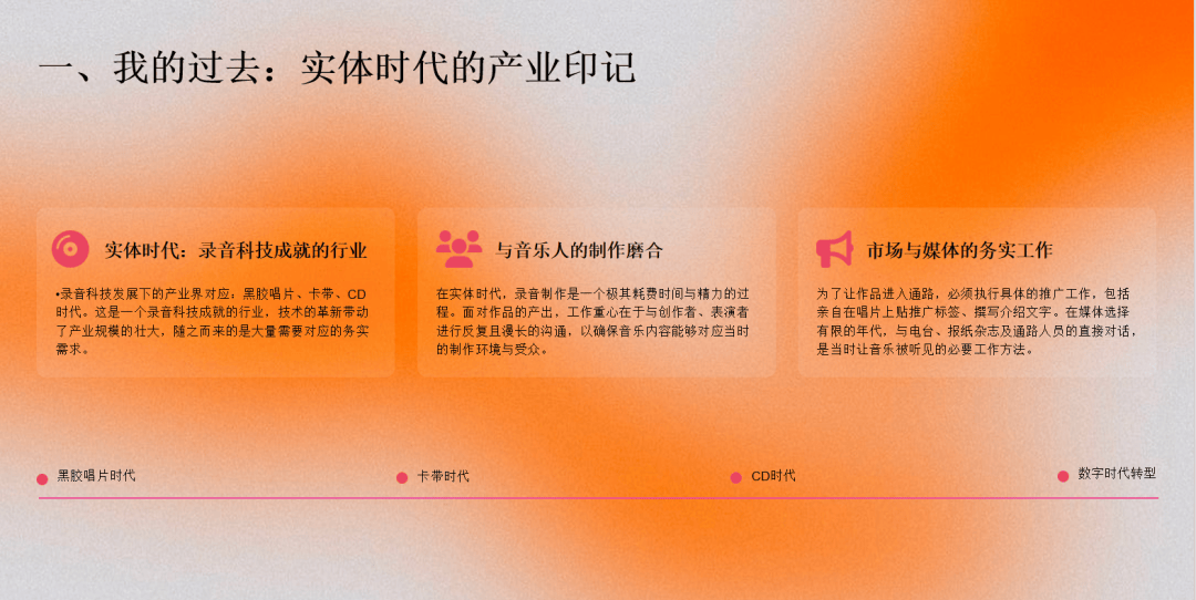 后面最大的挑战是整个实体产业的崩盘,我那时候正好管理百代,面对数位的兴起,所以当时雅虎等等这些数位平台我是恨之入骨,见了面我都不搭理。到后来慢慢理解,因为我发现了一件事情,唱片不是音乐产业,唱片其实是音乐产业在工业革命录音技术发展之后产生的一种传递音乐的模式,音乐产业就是以音乐为核心相关的互动、延伸、发展参与的人、事、物形成的一个面,那叫音乐产业。
