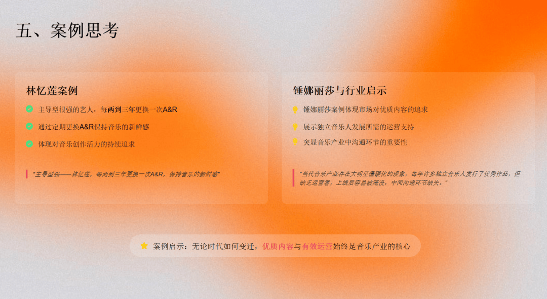 永远要懂得长远的看,知道好的作品在哪里,好的音乐人在哪里,如何让好的音乐人持续的有正向的创作,怎么让好的音乐表演者有一些越来越优质的表演。这些例子我特别要提的在我合作过的林忆莲,她每隔几年就换音乐合作伙伴,都是一些很有A&R思考者与她合作,这就让一个很好的表演者有一直有好作品的可能性。如果是产业者,你也要思考,有A&R思维的管理者为你去经营这个平台。那当然好的艺人你身边一定要有一个可以说服你,你信任的好的A&R合作伴侣,这是我这次最后我的要讲的一个核心。